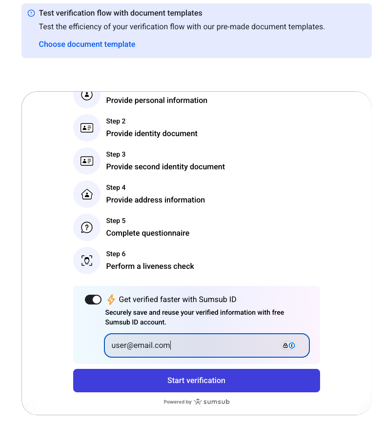 If you already KYC-ed with SumSub at a different provider you can enter your email before getting started. You will then be able to re-use your previously submitted KYC data. SumSub actually checks what is already on file and what is still needed, this means that you will only need to provide the missing details - saving you double work!